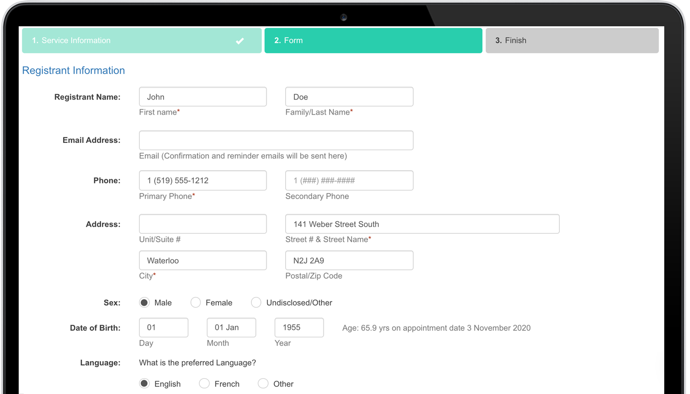 Once the service and appointment time have been selected, the client's data from CHRIS will automatically populate the Caredove referral form, including name, birth date, alternate contact information, and more. More information, including attachments, can be added to the form.